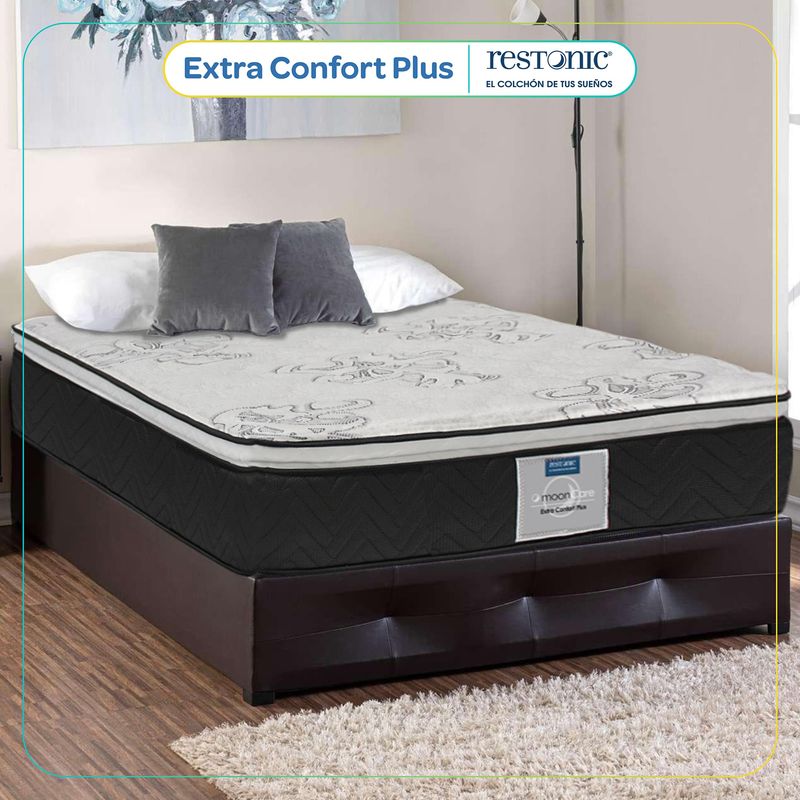 El colchón extra-confort Queen size tiene un diseño de colores blanco y azul que los hacen visiblemente más atractivo, es un colchón semi firme, tiene una estructura de 578 resortes continuos lo que lo hace más resistente, una doble colchoneta en la parte superior que le brinda más suavidad y confort, placa de espuma de alta densidad que prolonga la vida útil del colchón y ayuda a mantener la postura ergonómica.