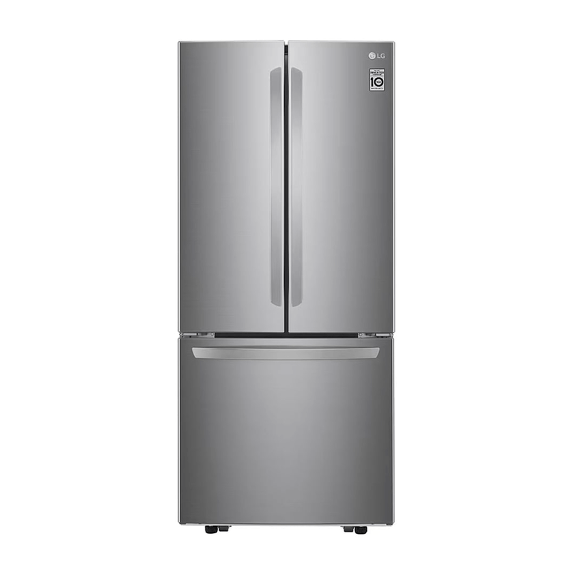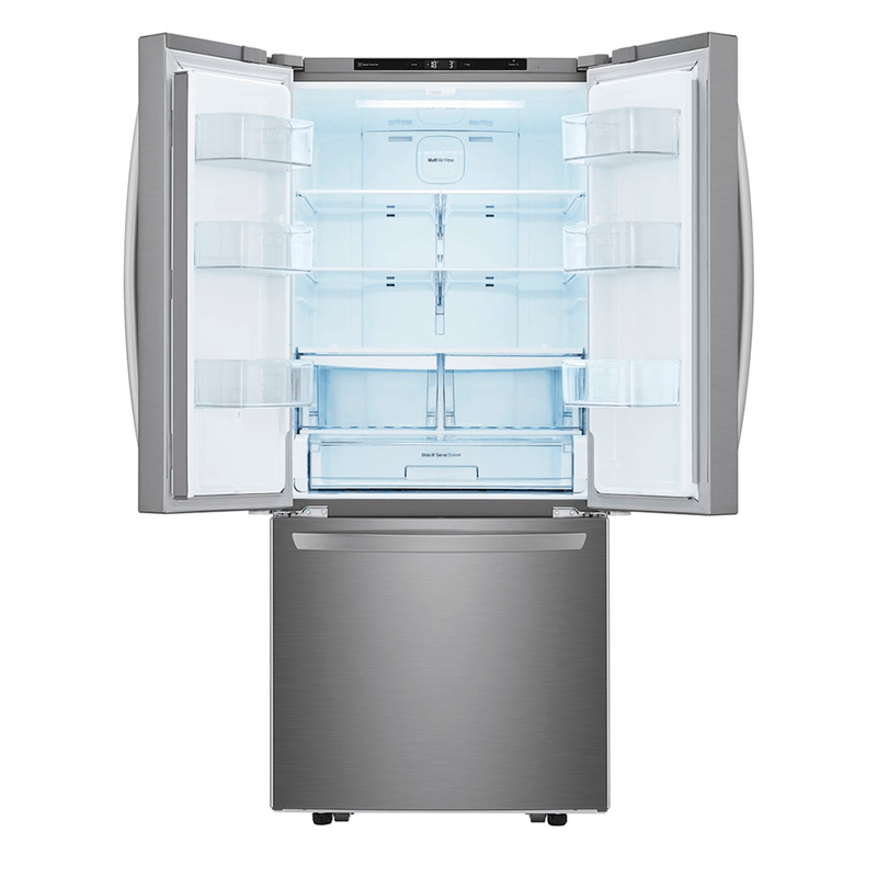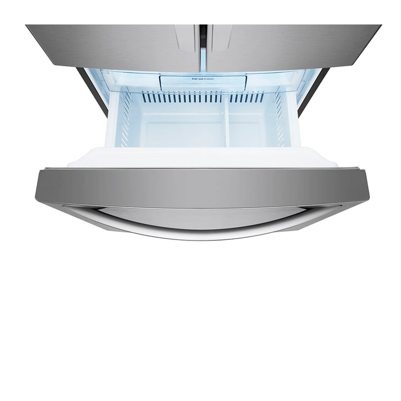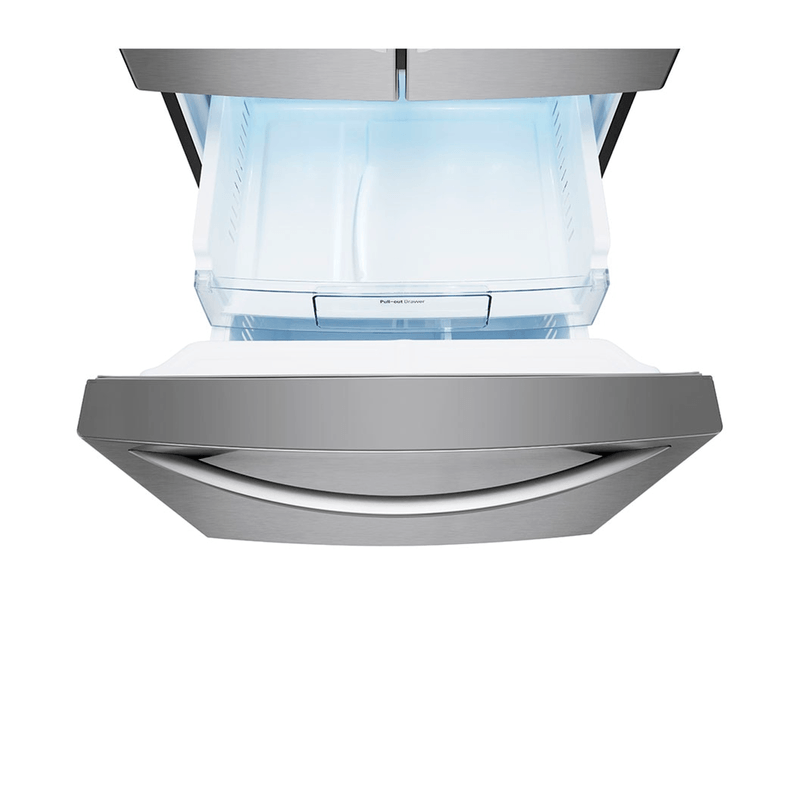 Refrigerador LG French door. de dos puertas en la parte superior y congelador extraíble en la parte inferior, con capacidad de 22pies, en color Platinum Silver.